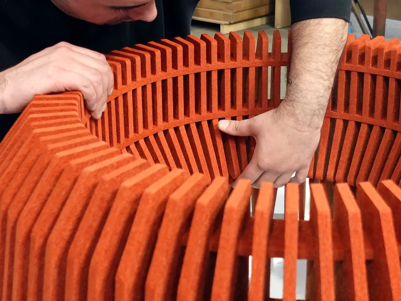 Trabajamos materiales como fieltro PET, yeso cartón, madera en varios formatos, HPL, laminados y enchapados, metal y muchos otros.