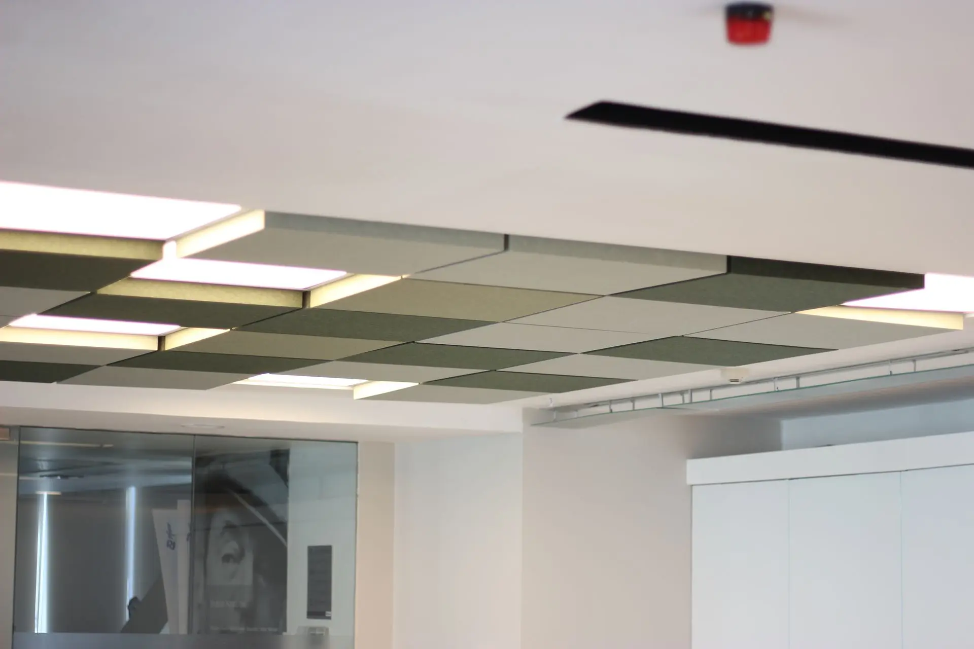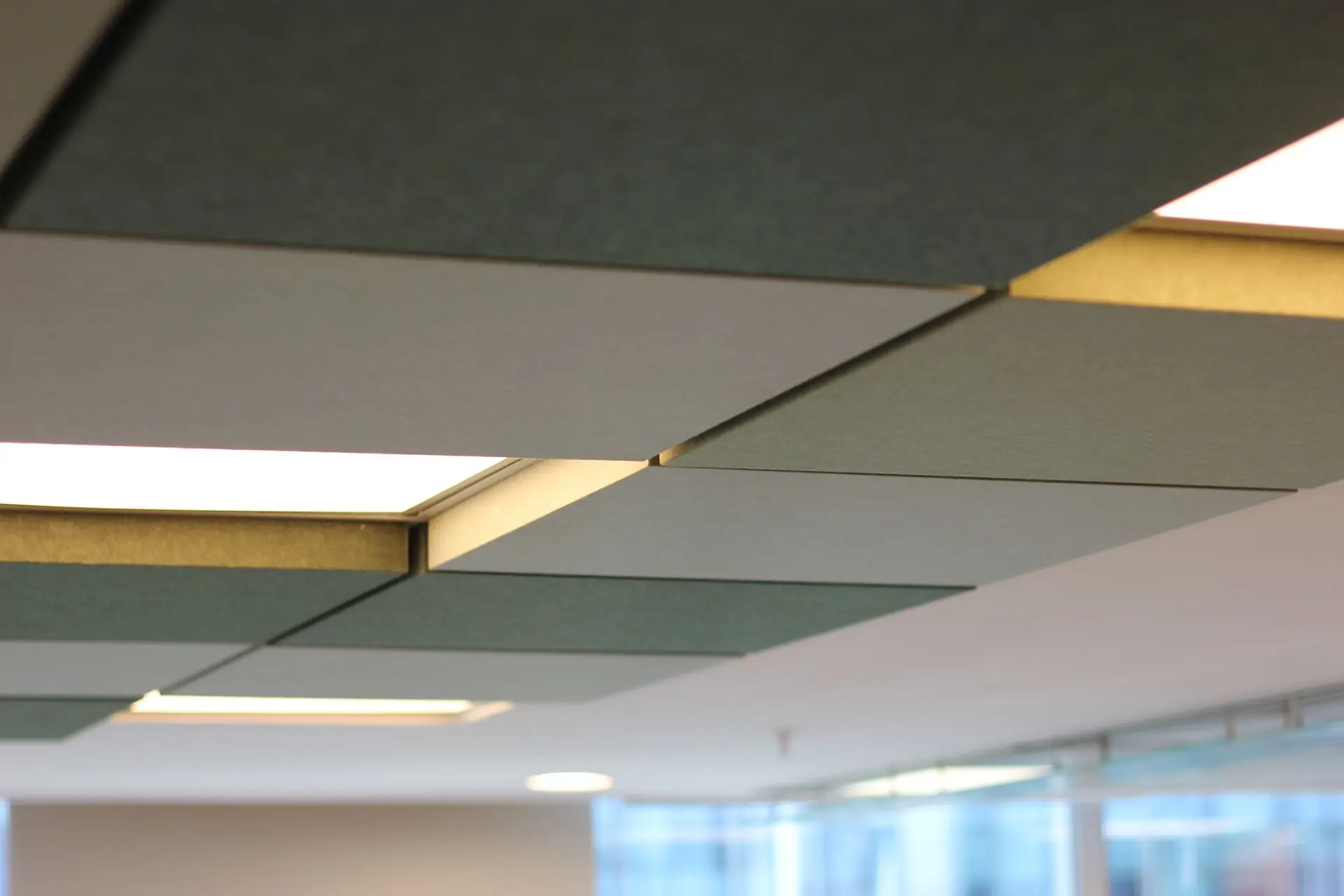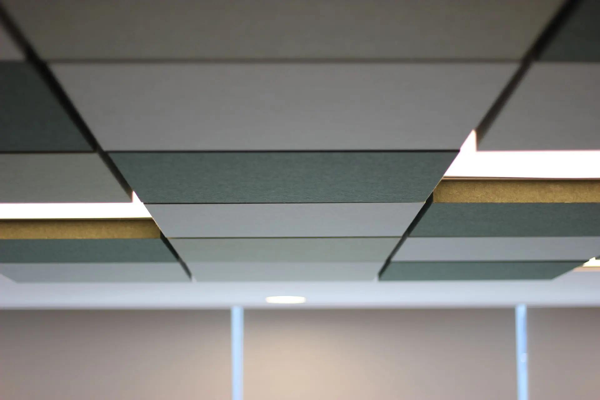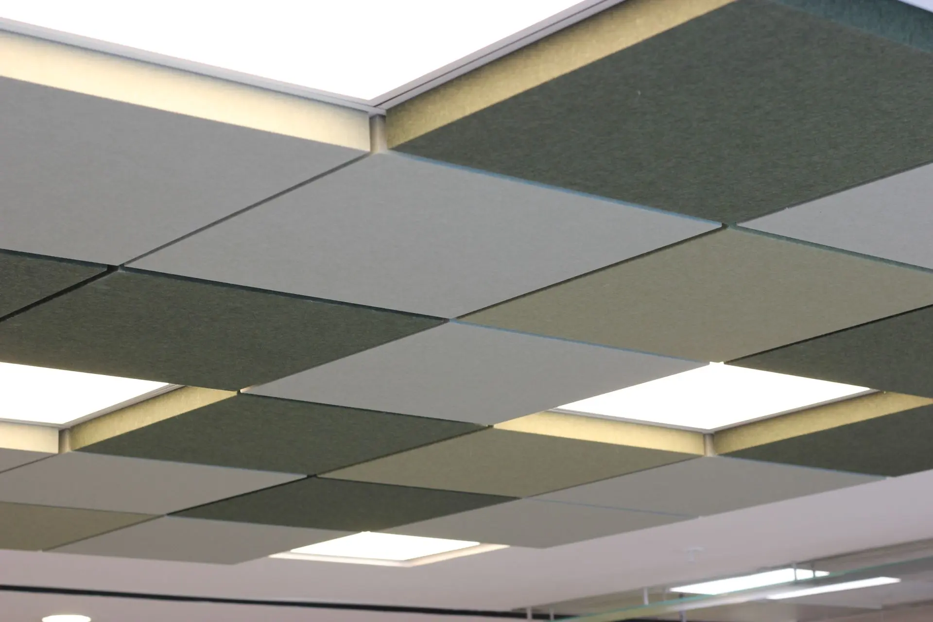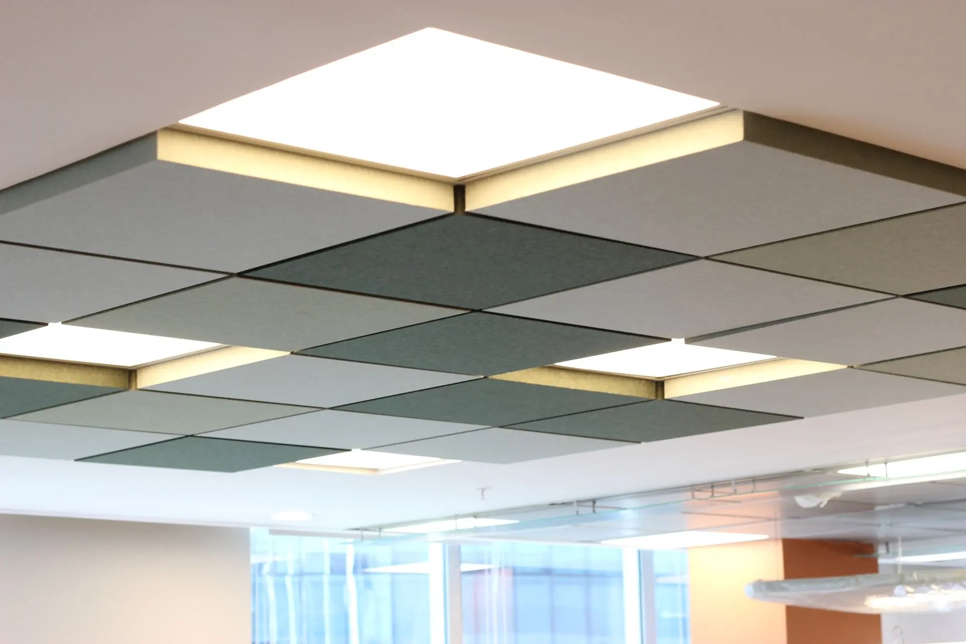 Oficina de una empresa farmacéutica ubicada en el Edificio Matta, en Las Condes. Se solicitaron múltiples productos de nuestra línea de acústicos, destacando el cielo americano dimensional en varios tonos verde.